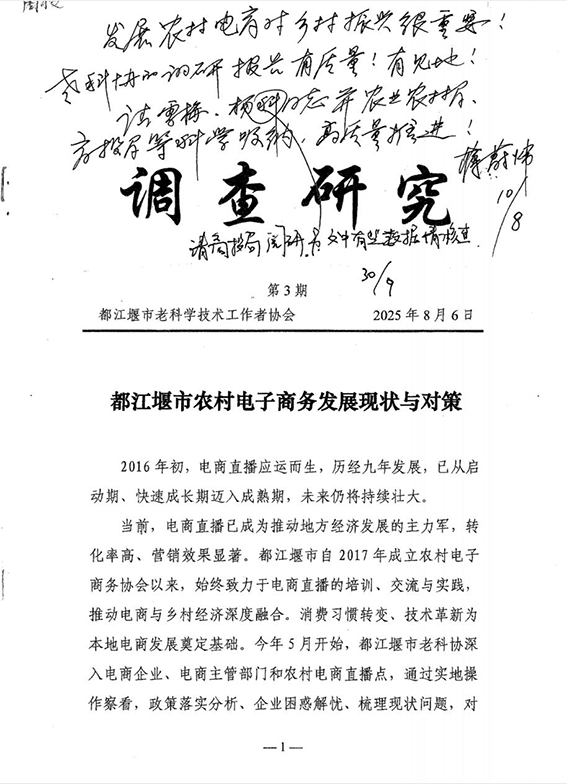 都江堰市委书记对老科协农村电子商务调研报告作批示