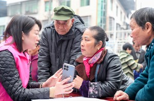 2023年11月24日,四川省广安市社会保险局组织的志愿服务小分队,带着“安宝”在华蓥市高兴镇向赶场的群众讲解利用移动网络查询参保情况的方法。(邱海鹰)