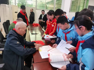 活动伊始,“坐姿端正、文明有礼、认真倾听”——随着主持老师富有小学特色的指挥语落地,阶梯教室里100余名同学们迅速抬头挺胸,目视前方,坐姿笔直。“少先队员出列,为来宾佩戴红领巾”——少先队员们一一为老领导和嘉宾们系上红领巾并行少先队礼。这一开场瞬间将活动仪式感拉满。