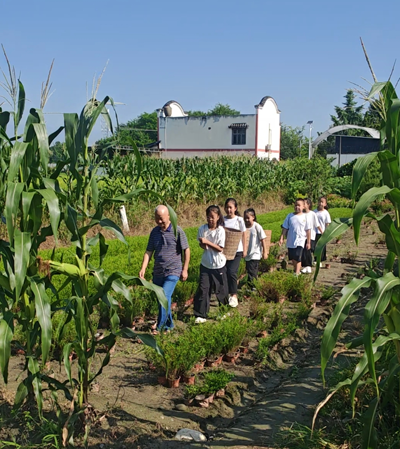 在水稻田间,他扶着业已扬花结籽的稻穗,传授栽秧薅秧技巧,讲述劳作田歌里的奋斗精神。孩子们弯腰拔野草和踮脚掰玉米的身影,成了田野间最生动的成长剪影。