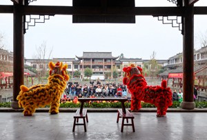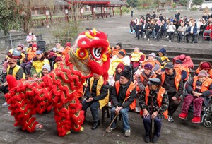 2023年12月20日,民间艺人在四川省华蓥市禄市镇凉水井村幸福院为老人们表演舞狮,让老人在寒冷的冬天感受社会大家庭带来的关爱和温暖。