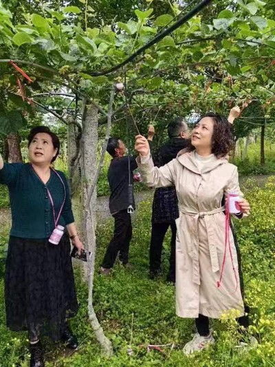 调研组一行穿行在猕猴桃地里,看着一排排翠绿的生机盎然的猕猴桃树,内心充满了希望和喜悦。韩绍泽老师耐心讲解种植、管理、授粉等技术要领,大家亲手体验了一次为猕猴桃授粉的经过:把花粉瓶挂在脖子上,一手拉着枝桠,一手拿着花粉刷,仔细地给每一朵花授粉。大家通过劳作感悟到,每一个猕猴桃从新芽到收获,需要付出许多的劳动和汗水,更应珍惜劳动者的每一份成果。