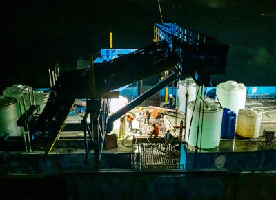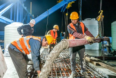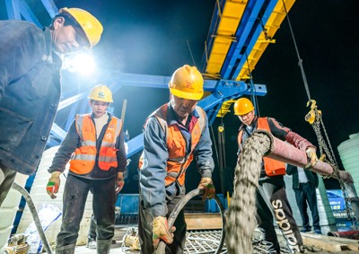 图为2025年1月18日晚,中铁十局的建设者挑灯夜战在西渝高铁四川省华蓥市清溪口特大桥跨沪蓉高速公路128米连续梁中跨合龙现场紧张作业。(邱海鹰)