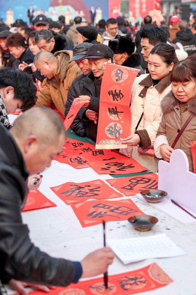 2025年1月20日,四川省华蓥市书法家协会的志愿者来到人流量较大的华蓥山广场,为市民义务书写春联和“福”字等门贴,祝福市民过上一个快乐祥和的新春佳节。