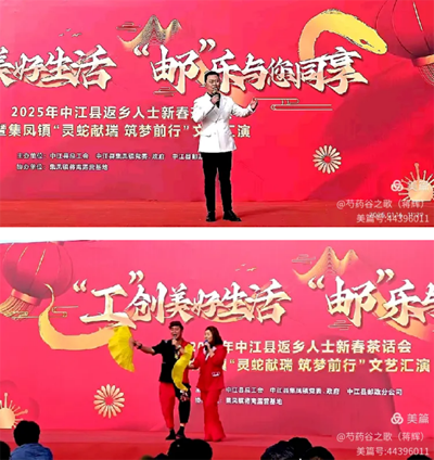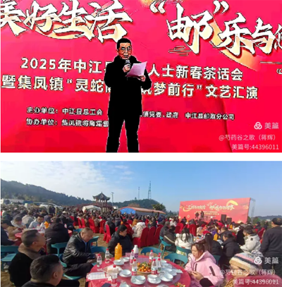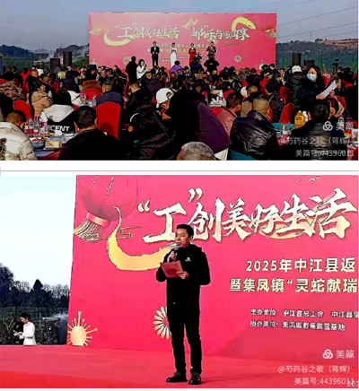 玉龙欢歌辞旧岁,金蛇狂舞迎新春。在中华民族传统的 春节即将到来之际,由中江县总工会中江县集凤镇党委、政府、中江县邮政分公司主办,中江县集凤镇芍药谷路营基地协办的“工”创美好生活 “邮”乐与您同享——2025年中江县返乡人士新春茶话会暨集凤镇“灵蛇献瑞 筑梦前行”文艺汇演在中江县芍药谷露营基地隆重举行。