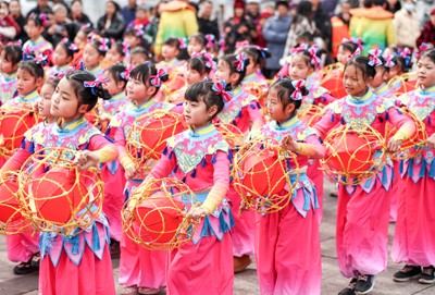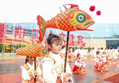 2025年1月26日,四川省华蓥市的小朋友在工人文化宫广场展演民俗文化节目走花灯,迎接新春佳节来临。