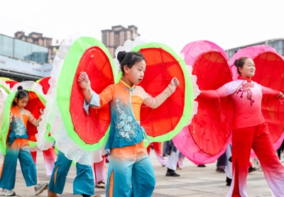 2025年1月26日,四川省华蓥市市民在工人文化宫广场展演民俗文化节目彩扇舞,迎接新春佳节来临。