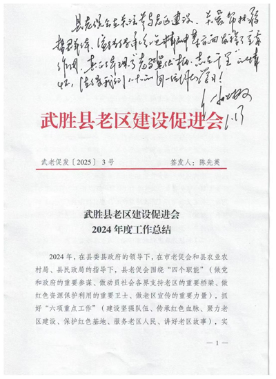 近日,四川省武胜县老区建设促进会向武胜县人大常委会主任付松柏报送了武老促会发〔2025〕3号:武胜县老区建设促进会2024年度工作总结,付松柏主任阅后对县老促会的工作高度赞誉,在文件上批示:县老促会在关注参与老区建设、关爱帮扶弱势群体、宣传传承红色精神等方面发挥了重要作用,真正体现了“老骥伏枥,志在千里”的情怀,值得我们人大的每一位同志学习!