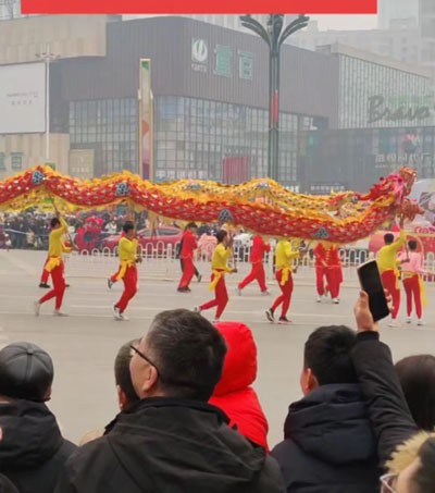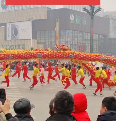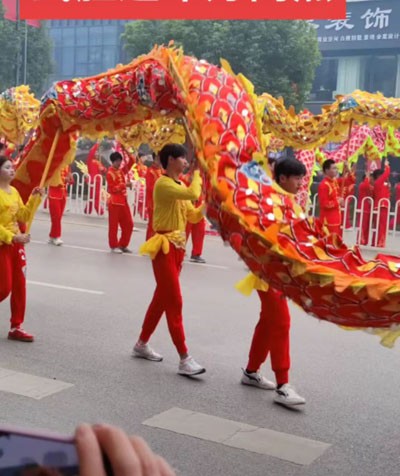 巨龙在街道上舞动起来,一会儿高高跃起,龙头直冲向天空,仿佛要冲破云霄,吸取天地间的祥瑞之气;一会儿又蜿蜒游走,龙身如波浪般起伏,活灵活现。舞龙者们配合默契,脚步轻盈又稳健,手中的木杆随着巨龙的舞动而灵活变换方向。