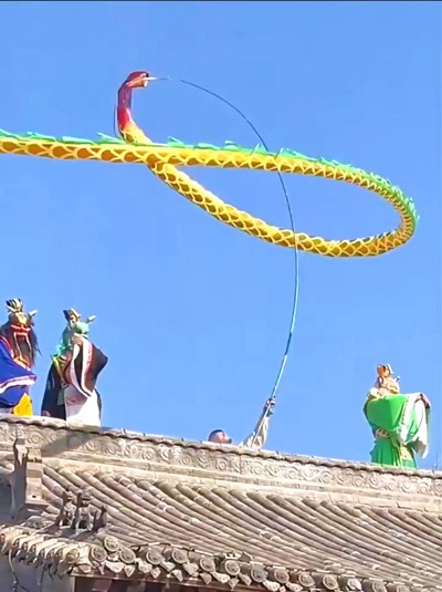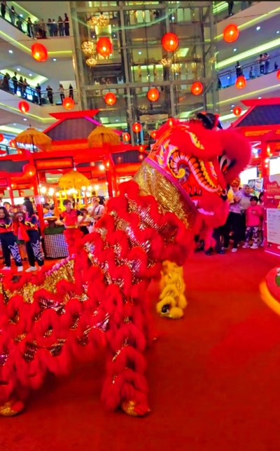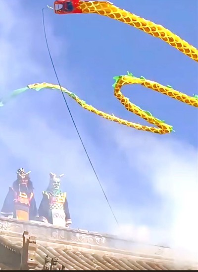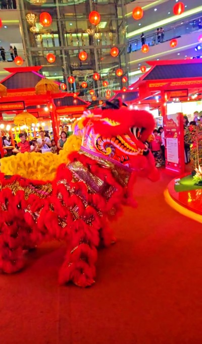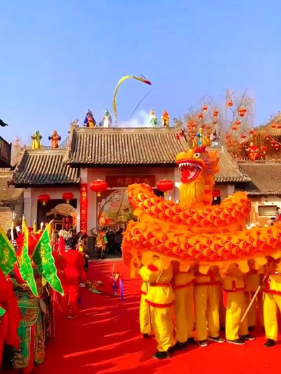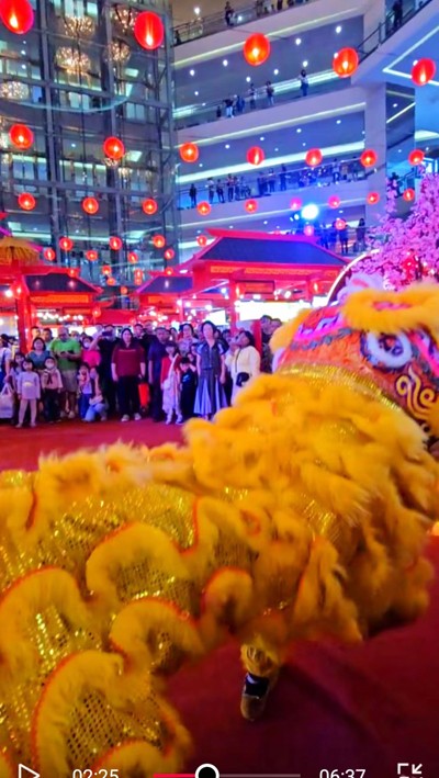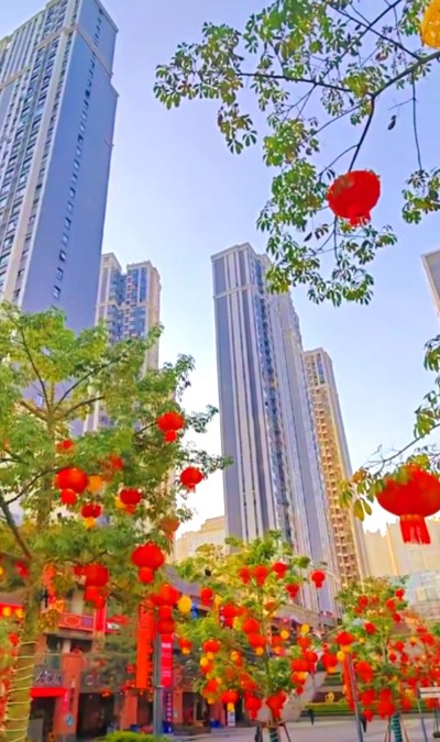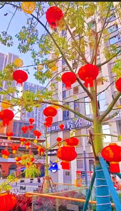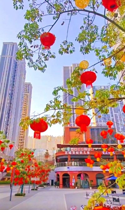 龙舞狮腾街巷闹,灯悬彩挂韵声飘。