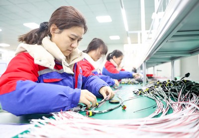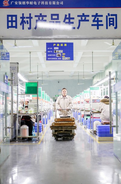 在四川省华蓥市民营企业发展平台华蓥山经开区,华蓥山领创电子有限公司智能车间的员工在生产流水线上紧张作业。