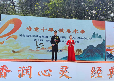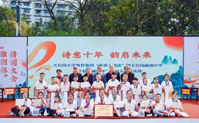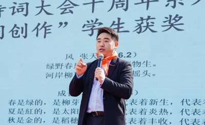 校长徐勇在致辞中介绍,“融创杯”诗词大会已成功举办十届,彰显了天台岗融创小学“融汇传统、创新未来”的办学思路,明确了“国学、国术、国艺”为载体,突出了传统文化办学特色,让每一个孩子在中国传统文化的浸润下幸福成长,实现学校“扎基石、显特色、创品牌”的发展总目标。大会以“诗意十年,韵启未来”为主题,希望与会嘉宾与师生们欢聚一堂,共享中华传统诗词之美。
