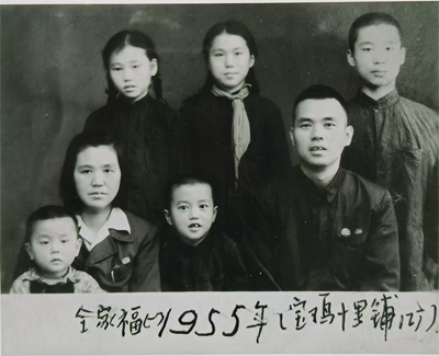 荣鸿琪(时8岁)1955年的‘全家福“合影,照片下侧为荣泉源回忆历史之手迹(其90岁 ——2000年写)。