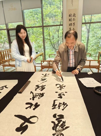 挂牌仪式结束后,南充、营山的书法家们即兴挥毫、笔走龙蛇,为大地魂酒业有限公司留下了一幅幅精美书法。彭继荣书写的《文化赋能企业、艺术点亮乡村》,直奔主题,令人赞叹。邓鹏双手捧着著名书法家刘泽笑为自己茶园写的两幅对联:“水可润心茶明德、诗能言志画寄情”,“翠叶凝香迎远客、清泉煮韵待知音”,脸上露出了欣喜的笑容,遂了自己久日的心愿。