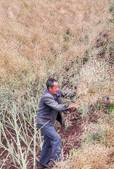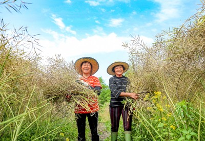 2025年5月9日,四川省华蓥市永兴镇大佛山村的村民奔忙田间,收割在以工代赈项目基地种植的优质油菜。