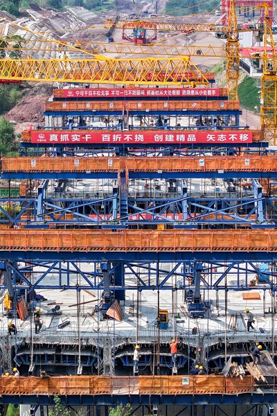 西渝高铁康渝段站前11标的中铁十局的建设者在广安东站四线中桥冒着酷热紧张施工。(邱海鹰 柏见真/文图)