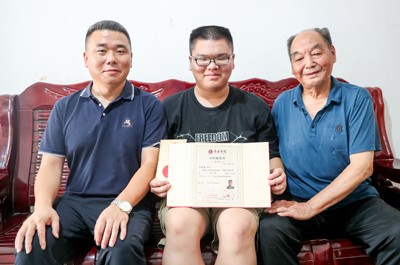 2025年9月4日,四川省华蓥市溪口镇溪华路社区即将奔赴山西吕梁学院就读的贫困大学新生刘渝鑫(中),与资助他的爱心人士程家亮(左)和抚养他的爷爷周成联(右)合影。