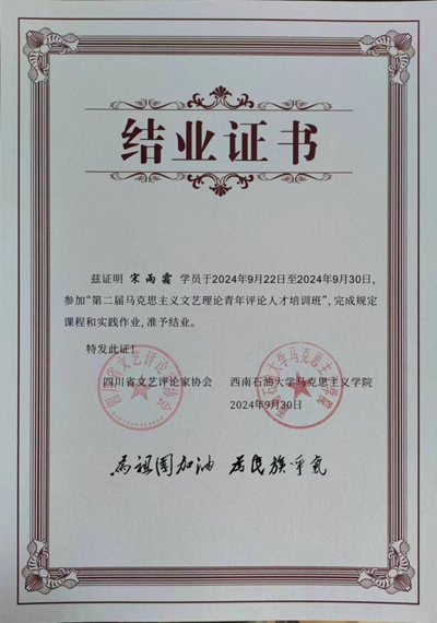 2024年9月22日至30日,由四川省文艺评论家协会、西南石油大学主办,四川省马克思主义文艺评论基地承办的第二届马克思主义文艺理论青年评论人才培训班在西南石油大学举行培训活动。成都文理学院青年教师、四川省文艺评论家协会会员宋雨霜经过选拔,与另外29名学员一起参加了培训活动,通过教学考核获得结业证书。