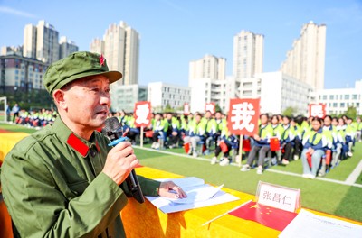 2024年10月15日,革命老区四川省华蓥市战斗英雄张昌仁,在华蓥二中向学生讲述自己在保家卫国中亲身经历的战斗故事,激发学生爱国主义精神和对国防事业的兴趣、热爱。
