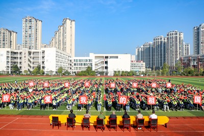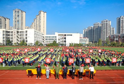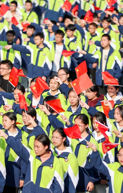 2024年10月15日,在革命老区四川省华蓥二中举行的《中华人民共和国国防教育法》宣传活动上,学生们舞动国旗齐声高唱《我爱我的祖国》。(邱海鹰/文图)