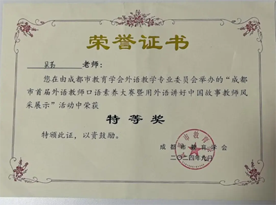 高中教师吴芳在双流区课堂教学大赛中获得二等奖,在成都市首届外语素养口语大赛中荣获特等奖。