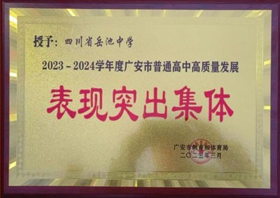 2025年3月7日,在广安市2024年高考总结会暨2025年高考冲刺动员会上,岳池中学校荣获“2023-2024学年度广安市普通高中高质量发展表现突出集体”和“2023-2024学年度广安市拔尖创新人才培养表现突出集体”2项荣誉称号!