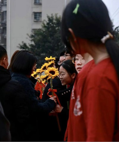 春晖不言,默默守护。家长手持向日葵花束,走向队列中的少年。“愿你永远追随光,成为光。” 一句祝福,一支花束,沉默的守望者终于站到聚光灯下, 用最朴素的向日葵,诠释最长情的告白。