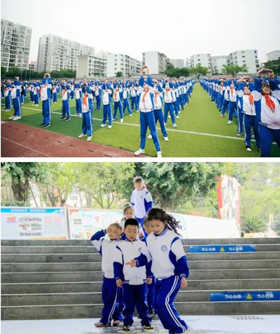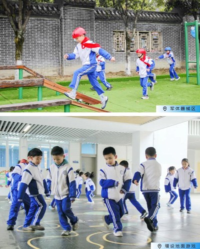 运动场统筹安排、增添军体器械区、增添教学区地面游戏、开发三套室内操、鼓励社区锻炼、家庭锻炼,形成了全方位、多层次的体育活动空间,保障学生随时随地都能参与体育锻炼。