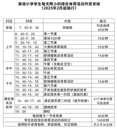必选必修(体育与健康课、大课间)、可选必修(阳光午休)、可选选修(早锻炼、课后社团)相结合,人人参与,人人落实每天不低于2小时综合体育活动。