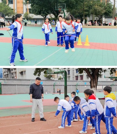 分学段规划不同项目,每班彩旗引领,杜绝站桩式活动,增添教学区地面游戏。家长志愿者参与指导“父母儿时的游戏”。