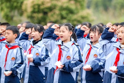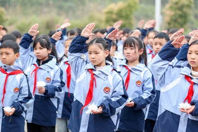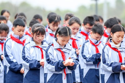 2025年3月31日,四川省华蓥市双河第二小学的少先队员在红岩广场参加清明祭扫活动,缅怀先烈,铭记历史。