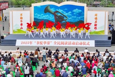 2025年4月17日,市民在四川省华蓥市举行的“川渝共建·阅享书香”2025年“书悦华蓥”全民阅读活动启动仪式上表演相关文艺节目。