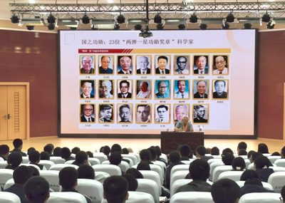 在宣讲过程中,张团长结合自己在马兰场区与邓稼先等一起战斗的经历鼓励同学们以“两弹一星”元勋们为榜样,树立远大理想,努力学习科学文化知识。“两弹一星”的成功研制,体现了无数科研工作者在艰苦卓绝的条件下,凭借着坚定的信念、顽强的毅力和卓越的智慧,克服重重困难铸就辉煌。他们干惊天动地事,做隐姓埋名人,将青春乃至生命都献给了祖国的国防科技事业。从罗布泊的巨响到卫星划破长空,每一个瞬间都凝聚着中华民族自强不息、勇攀高峰的精神力量。