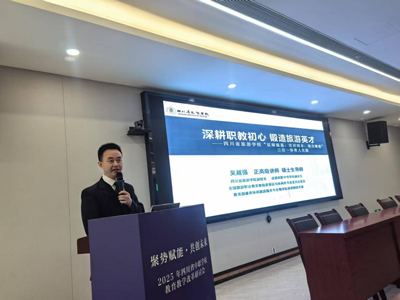 四川省旅游学校副校长吴越强以“深耕职教初心,锻造旅游英才”为主题,为大家介绍了四川省旅游学校“双师强基、实训固本、教改赋能”三位一体育人实践。会上,吴校长在职业教育产教融合、教学质量监控等领域做了精彩的发言,打造产教融合模式与成果,将专业群建在产业链上,将专业方向放在产业发展方向上,将师资锻造融入产业发展进程中,将学生培养放在生产经营过程中。对标行业发展趋势,打造“沉浸式”名实训基地。实行课堂革命新探索,创新人才培养模式。