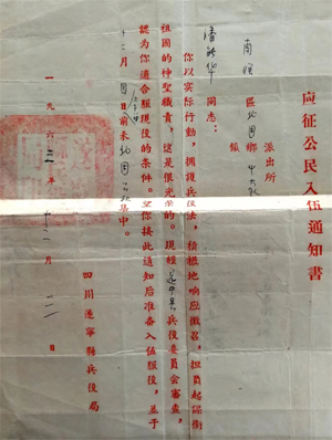 1963年底,我怀揣加入解放军的梦想,在征得母亲的同意后,我当即报名参加遂宁县一年一度的冬季征兵。通过严格的政治审查和健康体检。我完全符合征兵条件要求,被光荣录取。拿到公社武装部长送来的《应征公民入伍通知书》,生产大队的乡亲和儿时小伙伴都纷纷表示祝贺,我感到无比光荣和自豪。