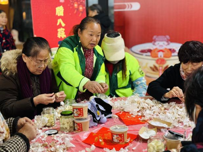 活动现场,一大锅锅热气腾腾、香气四溢的腊八粥成为了绝对的焦点,居民们纷纷排队品尝,享受着这份传统美食带来的温暖与甜蜜。此外,活动还特别设置了体验制作腊八蒜的环节,居民们在工作人员的指导下,亲手腌制腊八蒜,体验传统习俗的乐趣。