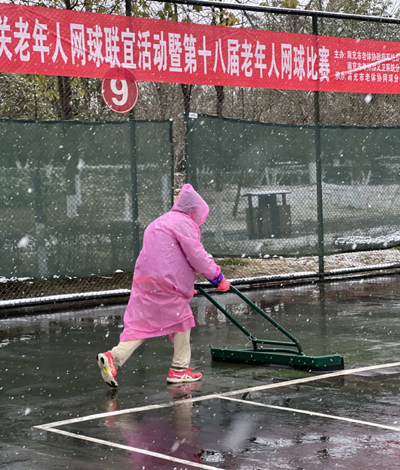 此次慰问背后,是谢淑蓉多年如一日对网球场的无私奉献。67 岁的谢淑蓉退休已20多年,家中还有生活不能完全自理的儿子。作为网球分会会员,她每日最早抵达球场,不是拿起扫把扫地,就是用推水器推水,一年360天从不间断。即便是下雨天,面对领导和球友的劝阻,她仍坚持清理球场,认为此时更能有效推走球场上的泥沙。2023年1月15日南充下大雪,她冒雪清扫完六片网球场才肯回家。