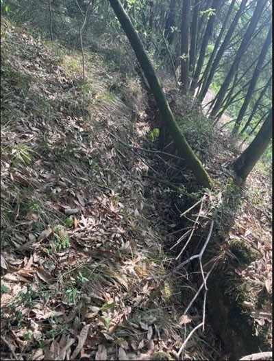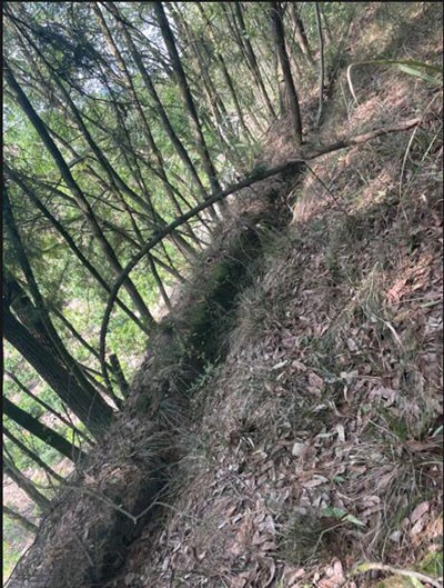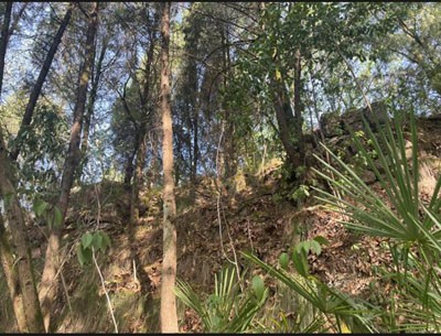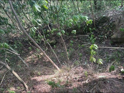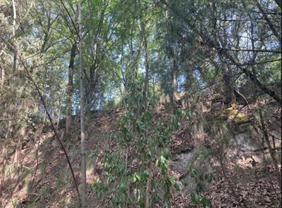 从王家寨出来,沿另一入山口蓬溪县照峰农业创新创业孵化园开车上山,约一公里,在被称为下寨的永乐寨寨坡下面停车。然后沿着一条垂高约20米、长500米左右的蜿蜒崎岖山路步行而上,来到一块林木葱郁的平整山顶,即为永乐古寨。