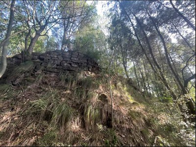 ▲从第二层坡地向上望,可见寨顶多处石墙堡垒。