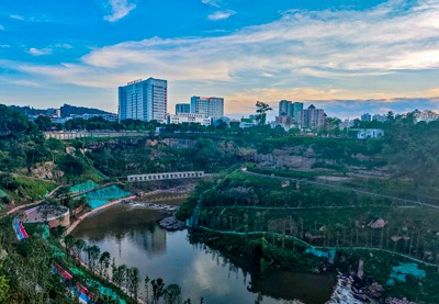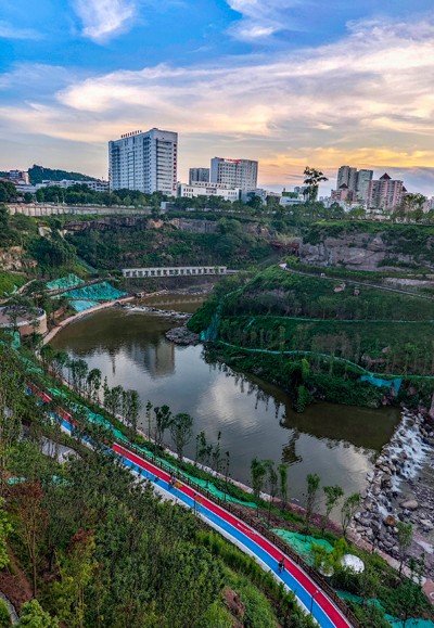 图为2025年7月2日,四川省广安市利用城区荒芜的西溪峡谷打造的在夕阳映照下的文旅新地标西溪峡公园。(邱海鹰/摄影报道)