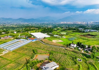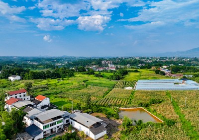 盛夏时节,四川省华蓥市永兴镇马架坪村连片泛着金黄的玉米、绿油油相继抽穗的水稻和用于种植养殖业的白色大棚及星罗棋布的民居,在蓝天白云映衬下色彩斑斓,如披锦绣,把乡村点缀得格外和美。