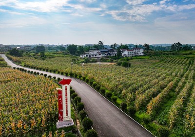 2025年7月21日,四川省华蓥市永兴镇马架坪村连片泛着金黄的玉米和宽阔的乡村公路及民居,在蓝天白云映衬下色彩斑斓,如披锦绣。