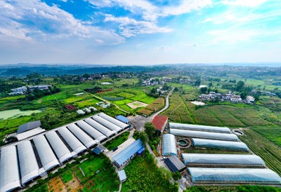 2025年7月21日,四川省华蓥市永兴镇马架坪村连片用于种植养殖业的白色大棚和泛着金黄的玉米、绿油油的水稻及星罗棋布的民居,在蓝天白云映衬下色彩斑斓,如披锦绣。(邱海鹰/摄影报道)