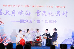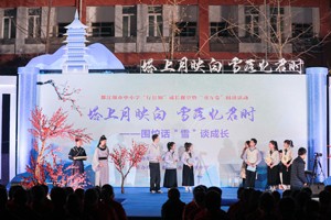 这场"盛宴"分别演绎了四个篇章。篇章一,师生们“推窗见雪,飞花净白”,走进了一场雪的记忆。从《咏雪》《踏莎行·雪似梅花》,到《梅花》《寿阳曲·江天暮雪》等,以一首首诗词,吟诵盛雪美景。后又以飞花令,对起了含“雪”字的诗句,并齐声吟诵《沁园春·雪》。