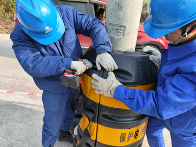 “这个防撞桶‘反光贴’很醒目,给电杆下端包上了一层保护,安全多了!”工作人员唐斌在为一处电杆安装了反光防撞桶后感慨地说。