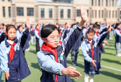 2025年3月27日,四川省华蓥市红岩小学的学生利用大课间练习交通警察手势信号广播体操(简称“交通手势操”),迎接第30个“全国中小学生安全教育日”。