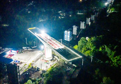图为2025年6月27日凌晨,在西渝高铁四川省广安段梅花坪临溪河特大桥拍摄的T构转体施工现场。(邱海鹰 宋启朋/摄影报道)