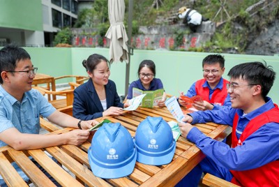 2025年8月21日,国家电网四川省华蓥市供电公司的党、团员志愿服务队,在红岩乡高顶村“原舍·嘿矿熊猫”民宿向工作人员宣讲电力安全知识。