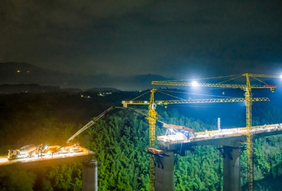2025年8月23日,中铁十局的建设者挑灯夜战在西渝高铁四川省广安华蓥市明月镇人和寨村林家沟特大桥连续梁合龙施工现场。(邱海鹰 刘 忠/文图)