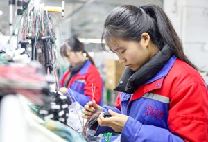 2024年2月19日,四川省华蓥市通过“春风行动”留在家乡的返乡民工,在华蓥山经开区大千电子有限公司生产流水线上安心作业。